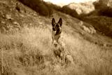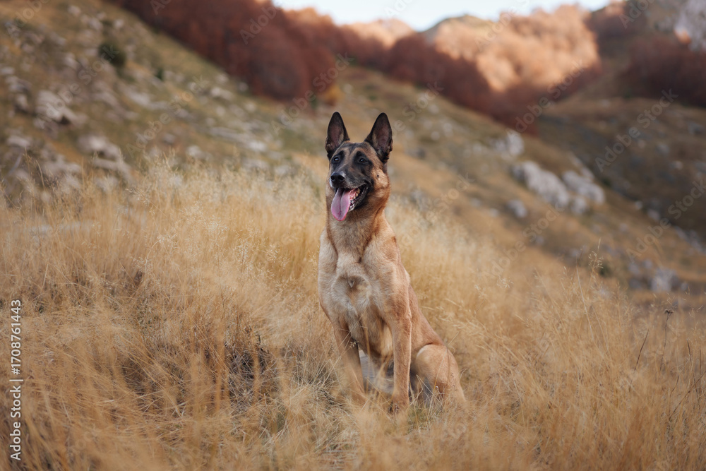 A Belgian Malinois sits on a grassy hill with a scenic autumn backdrop of colorful foliage. The dog poised posture adds elegance to the tranquil setting.