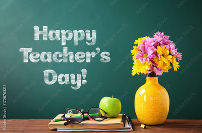 Happy Teacher's Day greeting card with flowers and text on green chalkboard