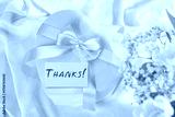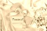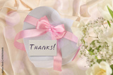 Thanks card, gift box and flowers on beige fabric, bokeh effect