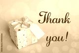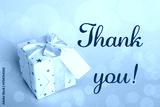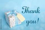 Thank you card design with gift box on light blue background. Bokeh effect