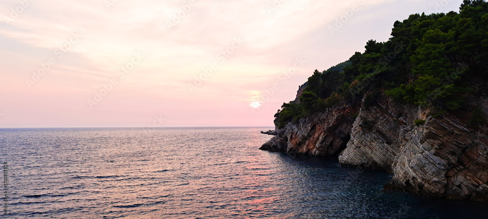 Dramatic rocky coastline with layered cliffs and lush green pines at sunset, overlooking calm blue sea waters reflecting soft pink and orange hues.