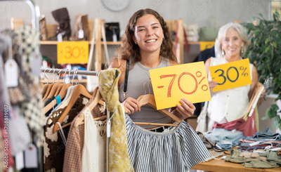 Two happy young and mature women holding special signs during sell-out in clothing store