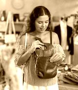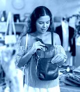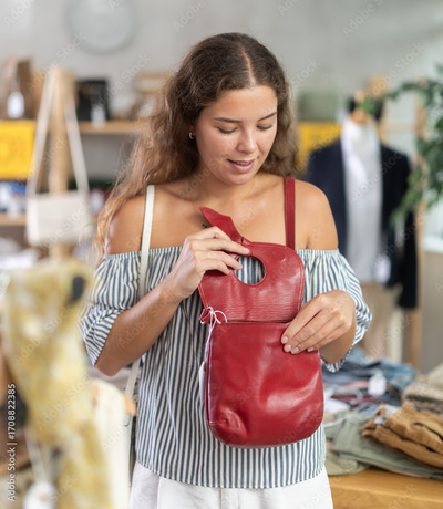 Young woman shopping - choosing a fashionable handbag in a clothing store
