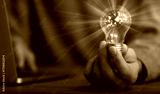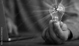 Man holding light bulb with brain illustration inside at table, closeup. Idea concept