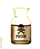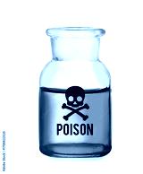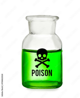 Poison warning symbol on glass bottle with green liquid against white background