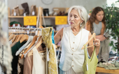 Elderly woman buyer choosing summer top in clothing store