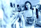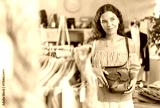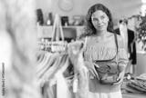 Glad young female customer reviewing colorful handbags during shopping in clothing store