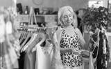 Glad old-aged female customer reviewing summer dresses during shopping in clothing store