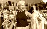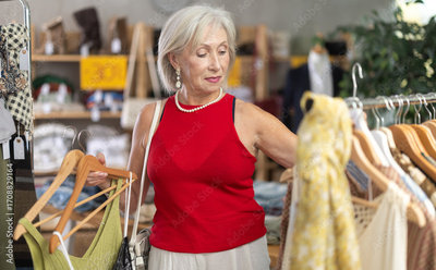 Hesitant old-aged female customer reviewing summer dresses during shopping in clothing store