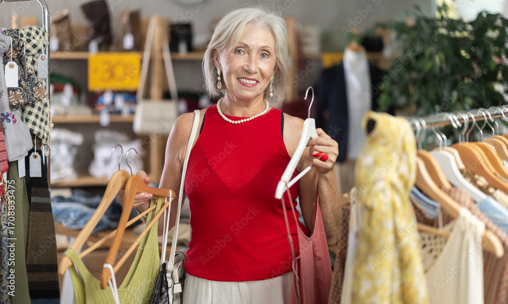Glad old-aged female customer reviewing summer dresses during shopping in clothing store