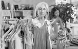 Elderly woman buyer choosing summer top in clothing store