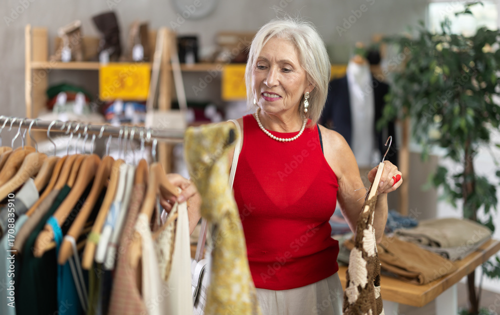 Positive joyful mature woman looking for fashionable clothes in a clothing boutique