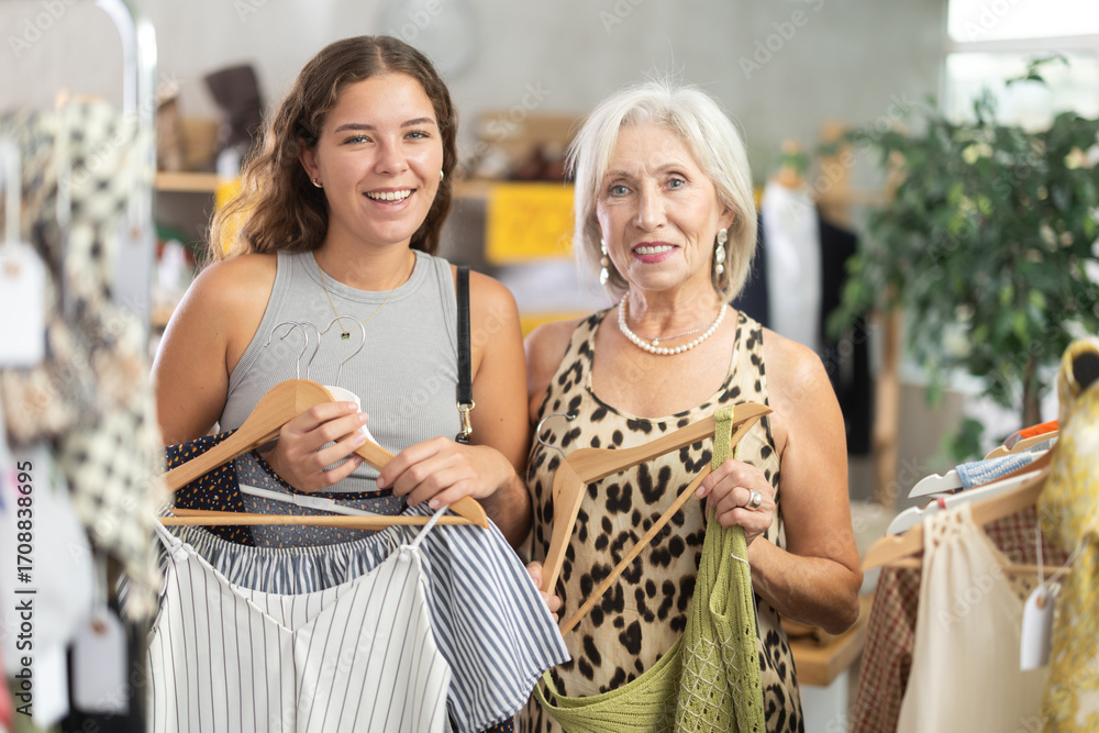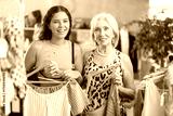 Two positive ladies looking for some summer wears during sell-out in retail outlet