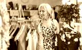 Glad old-aged female customer reviewing summer dresses during shopping in clothing store