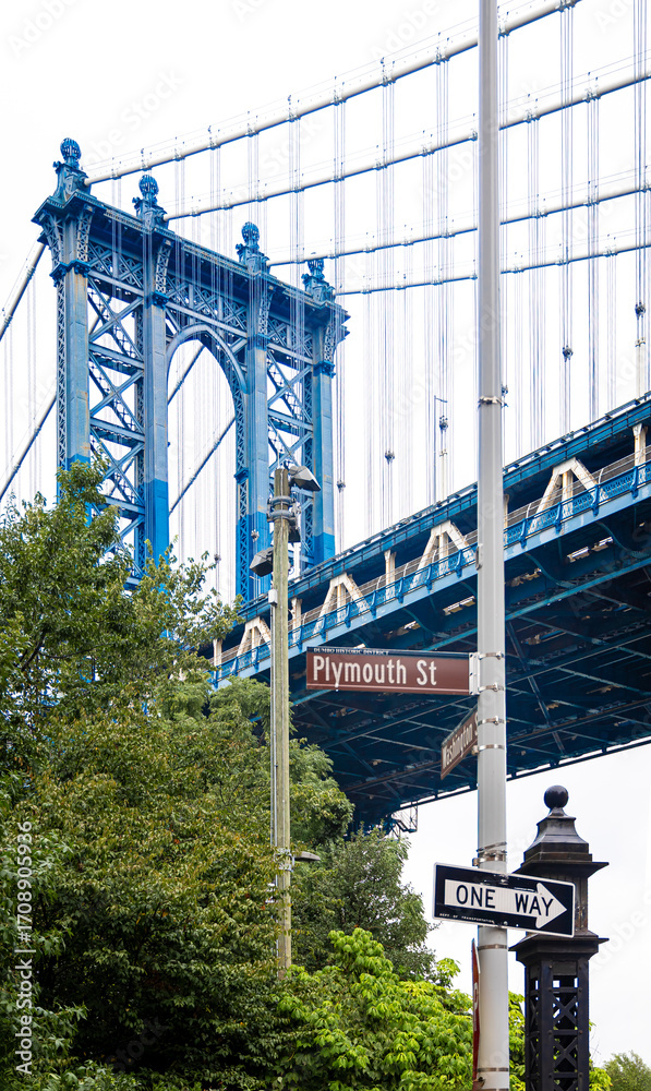 Manhattan Bridge view framed by red brick buildings in DUMBO Brooklyn