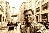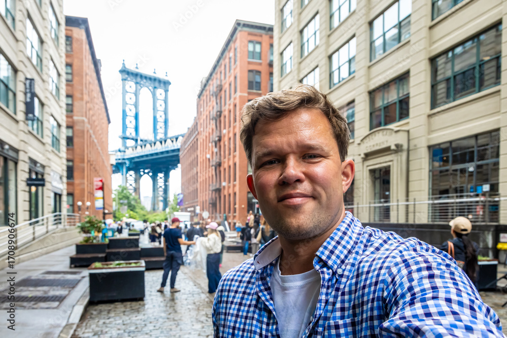 Manhattan Bridge view framed by red brick buildings in DUMBO Brooklyn