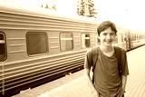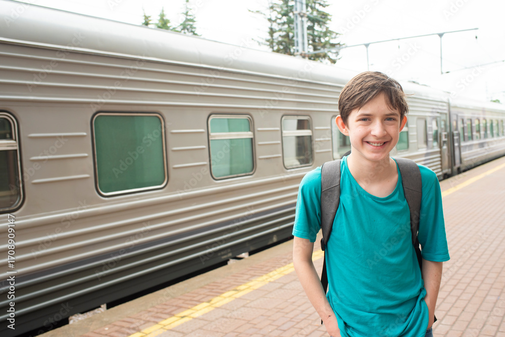 A smiling 12-year-old boy in a T-shirt with a backpack stands on the platform next to the train.