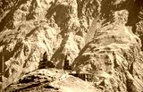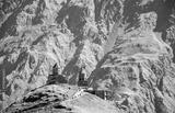 Medieval Georgian Orthodox Gergeti Trinity Church stands on a rugged hill Steep, rocky the Greater Caucasus mountains loom behind it. Georgia