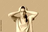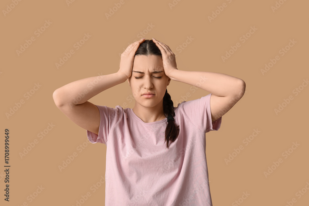 Beautiful young woman suffering from headache on beige background