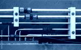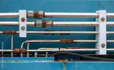 Row of steel hydraulic pipe lines close up view on a blue Marine equipment.