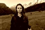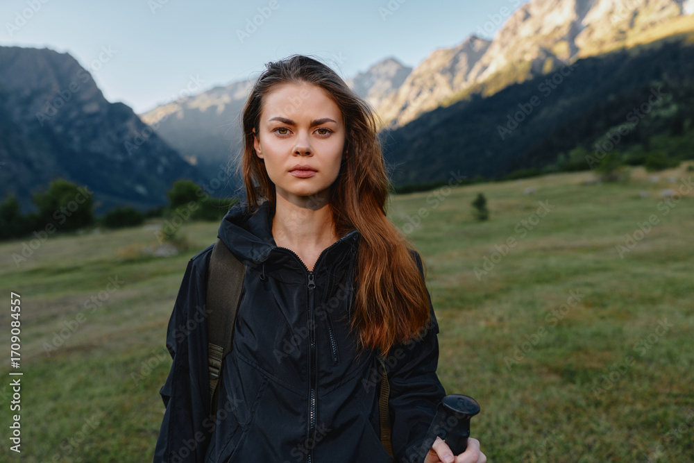 A focused young woman stands in a scenic mountain meadow, wearing a dark jacket and backpack. She gazes ahead with calm resolve, ready for an outdoor adventure.