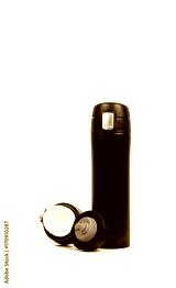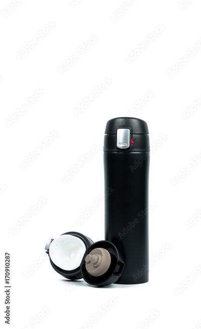 Black thermos bottle with opened cap isolated on white background with copy space