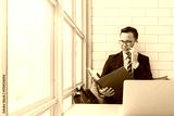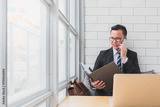 Young Asian businessman looking documents and using smartphone while sitting on sofa at home office or co working space background.Concept of young people working mobile devices.