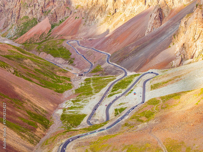 Aerial view of a spectacular winding mountain road with traffic snaking through rugged valley in Xinjiang, China.