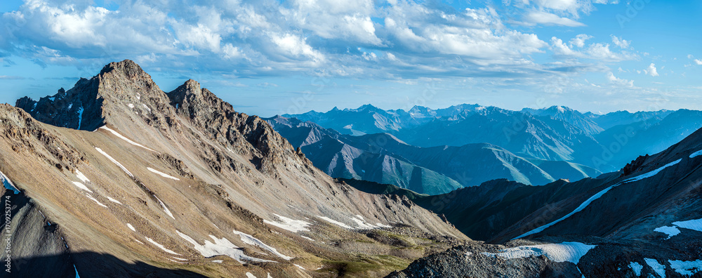 Majestic mountain range with rugged slopes under a cloudy sky