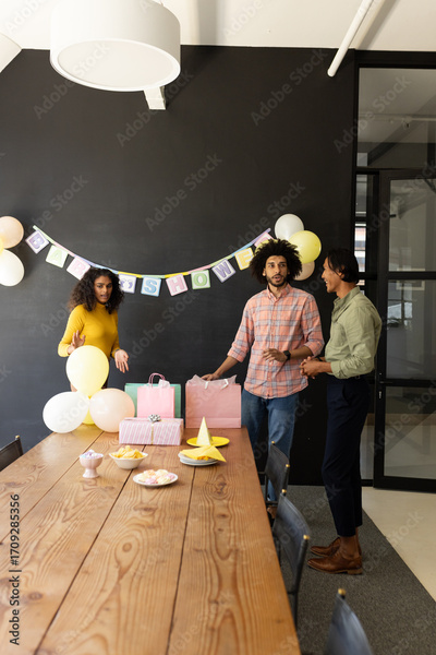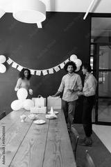 Colleagues preparing for office celebration with balloons and gift bags