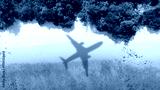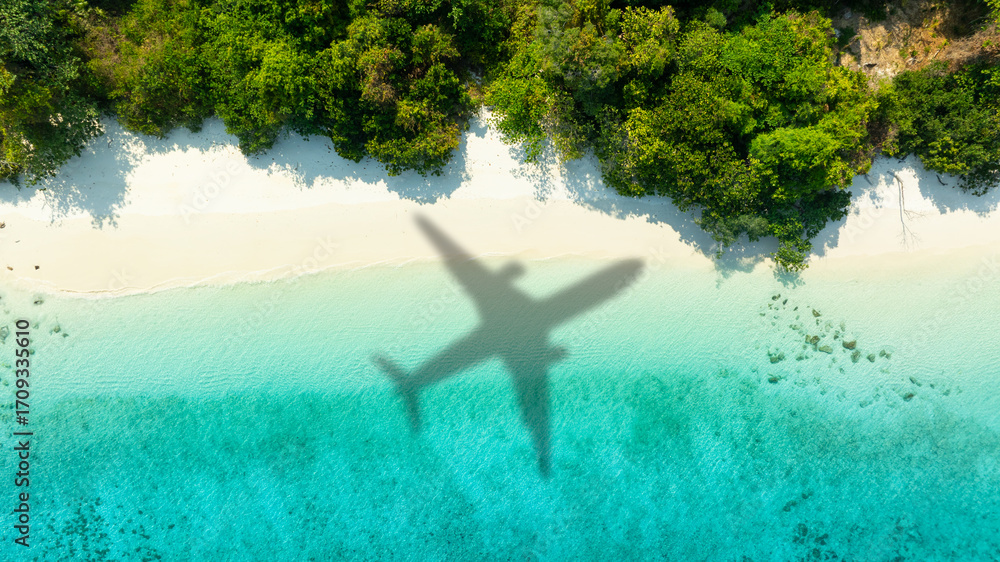 Aerial view of shadow passenger plane silhouette and sandy beach blue sea with waves at sea beach summer vacation sea travel concept