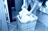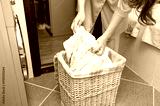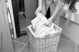 Woman taking dirty laundry from basket to washing machine in bathroom