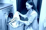 Beautiful housewife in silk robe sorting dirty laundry by washing machine at home