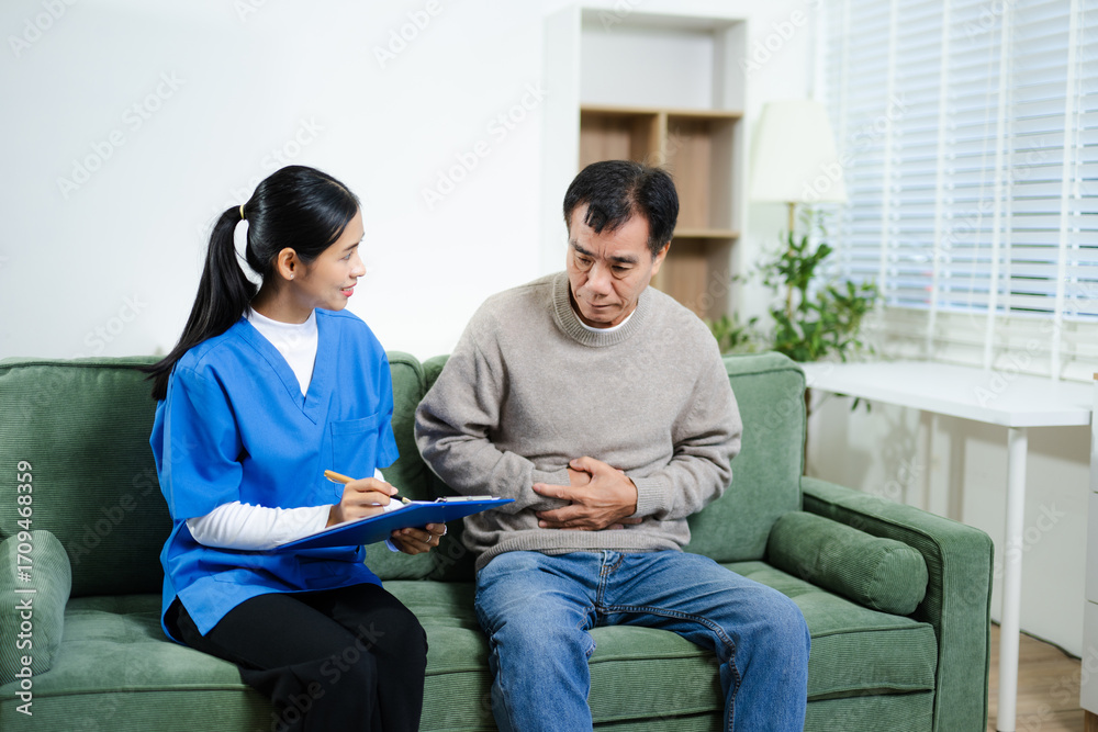 Healthcare nurse explains report to senior man in home visit. A moment of care, trust, and clarity in elderly consultation. Real people in medical discussion concept