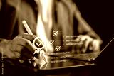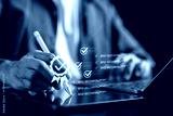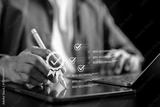 Digital form document check with approval and certificate badge on tablet, compliance verification, checklist validation, audit process, and business workflow in corporate management.