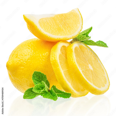 Bright fresh lemon with slices and green mint leaves on a white background, top view with copy space for advertising, design, and healthy food concept
