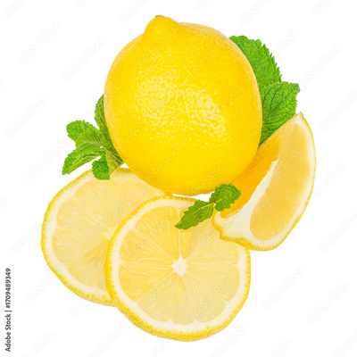 Fresh yellow lemon with slices and mint leaves on white background, top view