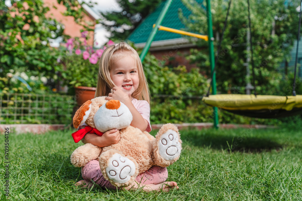 Caucasian child girl hugs a big toy bear in the garden in summer