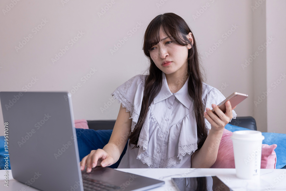 A Japanese woman worried with laptop in the living room during work