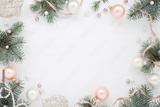 Holidays frame of new year`s decorations on white background. Fir branches, balls, ribbon and pearls, pastel colors