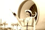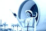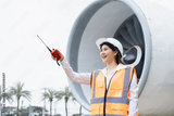 An Asian woman stands confidently in front of a jet engine,wearing a safety helmet reflective vest,holding tablet,representing aviation engineering,safety inspection,professional roles in airline