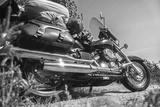 A black cruiser motorcycle, heavily loaded with travel gear, parked on a dirt road under a clear blue sky. Perfect for showcasing road trips, adventure, and freedom.