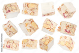 Traditional Italian Christmas dessert torrone nougat pieces with nuts and honey isolated on white background.