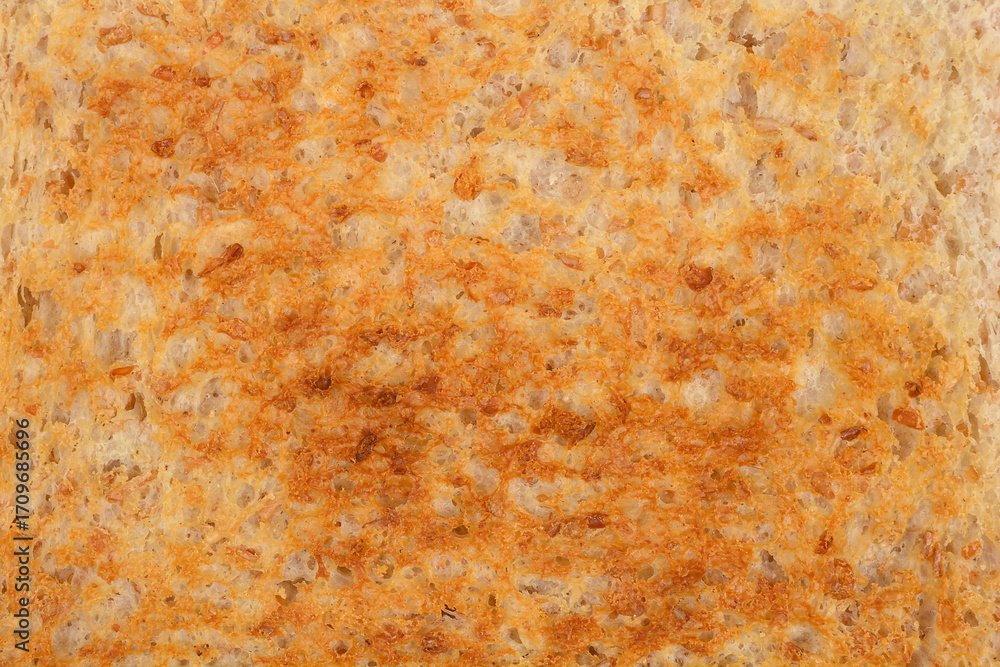 A full-frame, close-up, and detailed texture shot of a slice of golden-brown toasted bread with a porous surface
