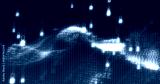 Cascading binary digits forming undulating wave in cyberspace, with code streams and grid squares