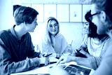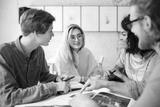 Portrait of young people sitting in office and happily looking at each other while discussion something. Group of cool guys working on new project in office. Young students creating something new