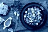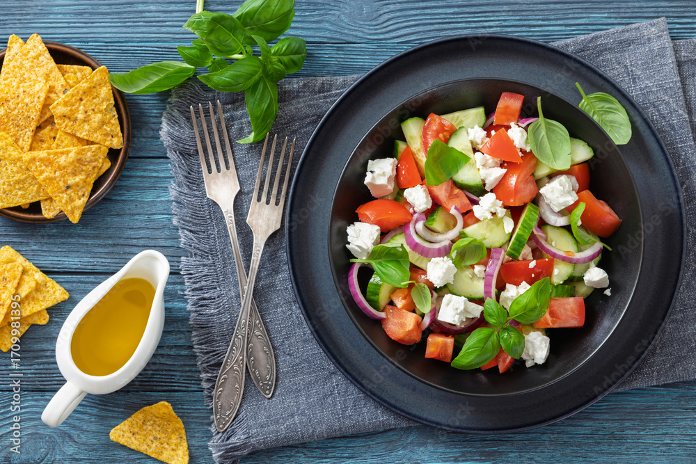 tomato cucumber salad with goat cheese, basil