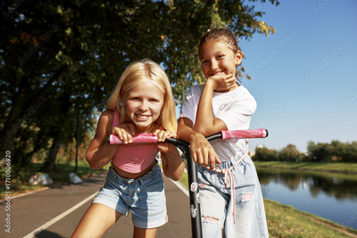 Two smiling girls enjoying a sunny day at the park with a scooter