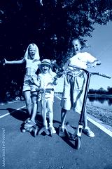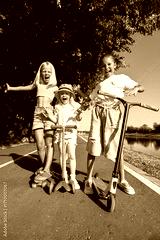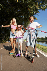 Group of cheerful kids riding scooters outdoors on a sunny day in summer