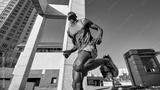 Athletic man stretches in urban setting surrounded by modern architectural structures